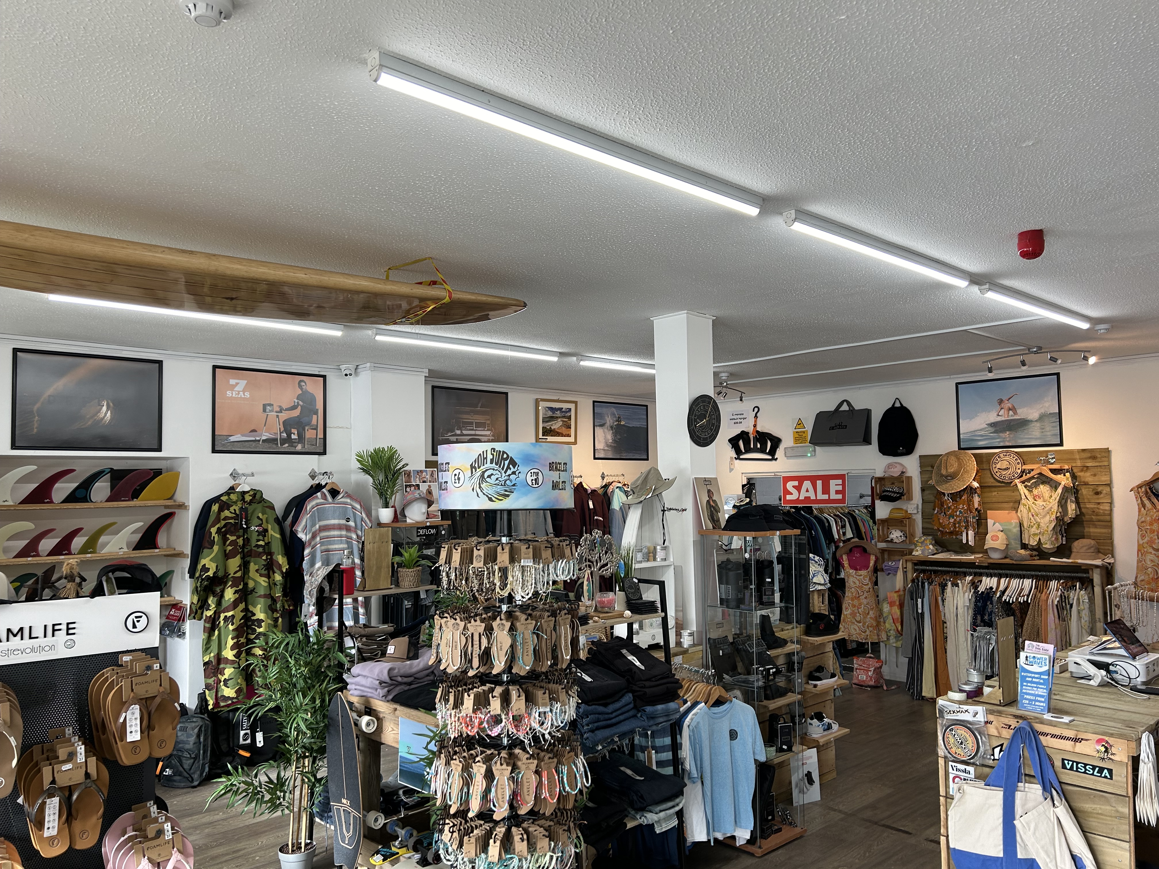 Love Waves is a New store we set up on Gower road, swansea. The idea was to showcase our brands and stock related brands. We wanted to have a modern surf shop feel to match the new brands we deliver. the old school sandy floor stacked racks and board rental shop is great at the beach but has been long left behind as a retail experience.